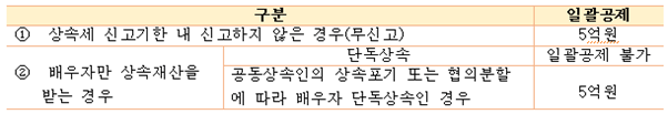 다만 배우자가 처음부터 단독으로 상속받는 경우에는 일괄공제(5억원)는 배제하고, 기초공제와 그 밖의 인적공제액을 합한 금액만 공제합니다. 이와 달리 공동상속인이 상속을 포기하거나 또는 협의분할에 따라 배우자가 혼자 상속받는 경우에 일괄공제(5억원)를 적용할 수 있습니다.