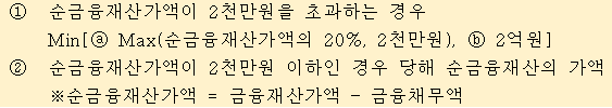 이에 금융재산에 관한 과세의 형평성 문제를 보완하기 위해 마련한 제도가 금융재산 상속공제입니다. 금융재산에서 금융부채를 차감한 순금융재산을 기준으로 그 가액이 2천만원을 초과하면 순금융재산의 20%와 2천만원을 비교하여 큰 금액을 공제해주고(한도 2억원), 순금융재산이 2천만원 이하인 경우에는 순금융재산 전액을 공제해주고 있습니다.
